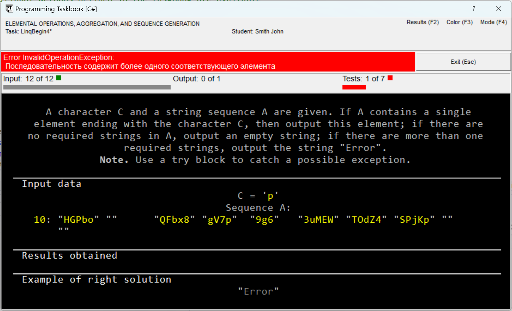 LinqBegin4°. A character C and a string sequence A are given. If A contains a single element ending with the character C, then output this element; if there are no required strings in A, output an empty string; if there are more than one required strings, output the string "Error". Note. Use a try block to catch a possible exception.